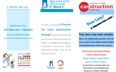 As latas poderão ser entregues até final do 1º período, junto do diretor de turma, em saco próprio e identificado. Haverá prémios para a turma que entregar o maior número de latas. As latas devem ser entregues cheias com rótulos intactos e sem amolgadelas para que possam ser doadas a instituições de solidariedade social.