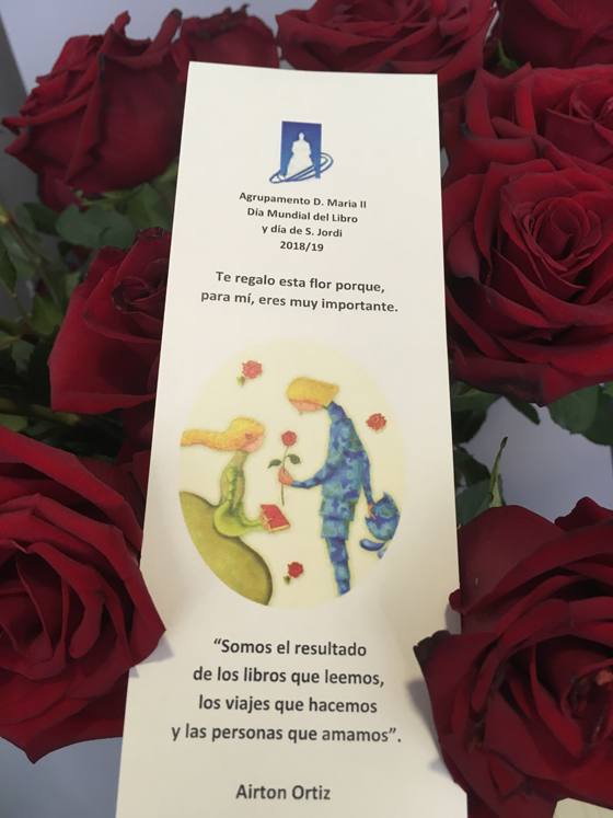 Cumprindo a tradição, os alunos distribuíram pela comunidade escolar rosas vermelhas naturais, acompanhadas por um marcador de livro com a mensagem “Te regalo esta flor porque, para mí, eres muy importante”, onde também se pode ler a romântica lenda de S. Jordi a evidenciar o triunfo da coragem e do amor.