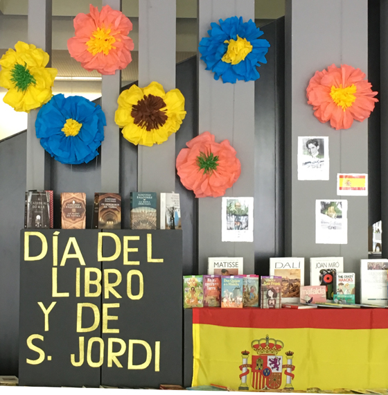 A 23 de abril celebra-se o dia mundial do livro, instituído pela UNESCO (desde 1995), procurando despertar a importância do livro e o prazer da leitura. O grupo de Espanhol, em parceria com a biblioteca, preparou uma exposição, misturando livros de autores hispânicos com o aroma das rosas, para que os alunos tivessem a oportunidade de contactar com as tradições perpetuadas nas comunidades autónomas de Aragão, Catalunha e das Ilhas Baleares.